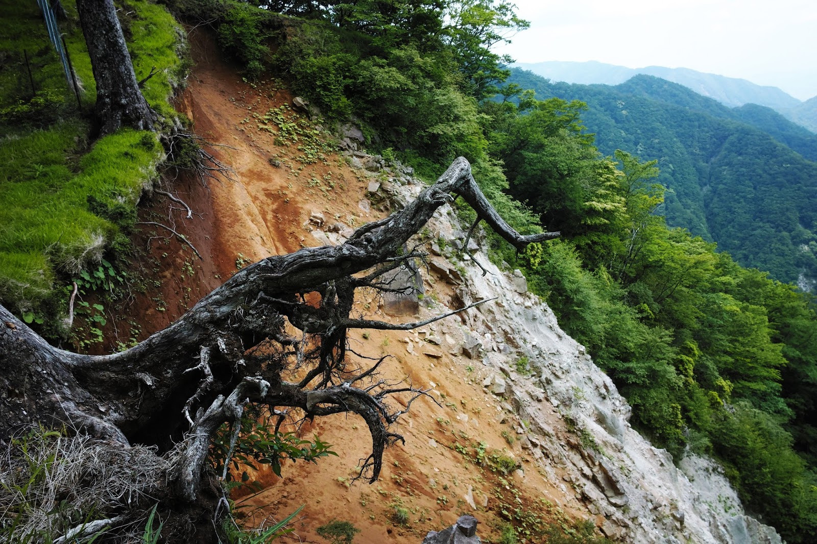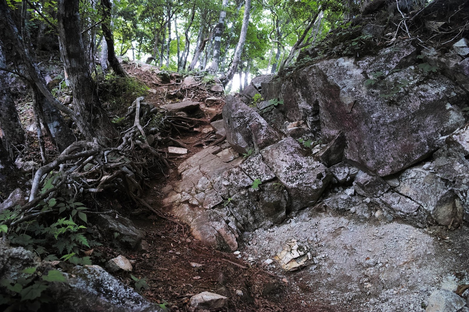 登山道は所々で山肌を深く切り込み、露出した岩肌が痛々しい。