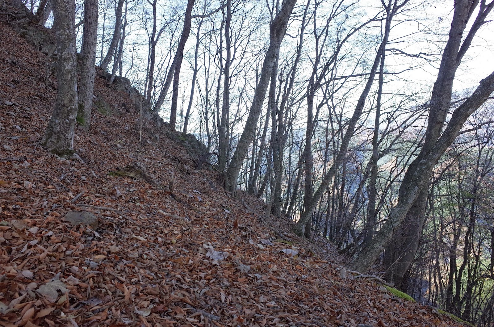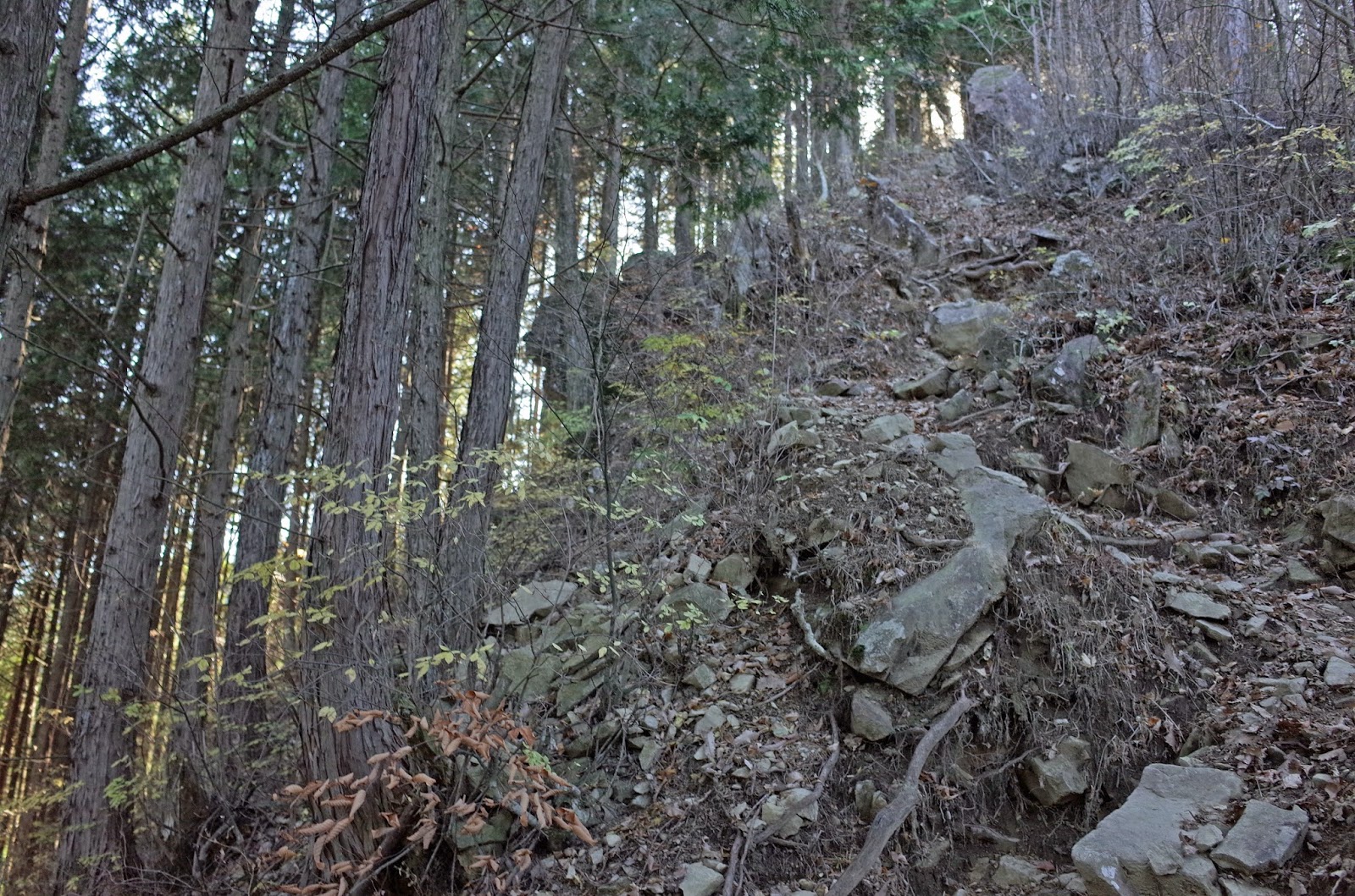今回、ヌカザス尾根を三大急登ということで登ってみたが、途中の落ち葉のザレ場は「オツネの泣き坂」といわれる名所であったことを後で知った。その昔、オツネという女の子が恋人との逢瀬からの帰り、夜が明けようとして、見つかったら旦那様に叱られると泣いた所がこの坂だそうだ。決して坂がつらくて泣いたわけではない。いや、むしろ三頭山を越えて恋人との逢瀬をしたのだからオツネさんは健脚であった。せっかくだから、オツネの泣き坂がどんなに急斜面なのか画像を追加しました。
