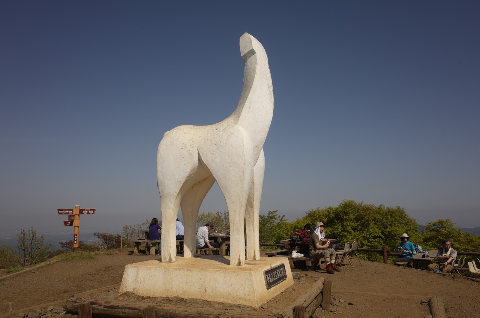 堂所山では小休止にとどめ、高尾の主稜線と合流して陣馬を目指す。さすが主稜線だ。ここまでの静けさから一転して登山者の声が登山道に賑やかに響く。陣馬の手前、明王峠で霞んだ富士を眺めながらランチを採り、やがて陣馬への長く緩い登りを登り詰め、陣馬山に達したのは14時。この最後の陣馬への登りは疲れた身体にきつかった。が、陣馬の白いオブジェが無言で私を迎えてくれた。山頂はグループ登山、家族登山の人々で賑わっている。国際色も豊かだ。