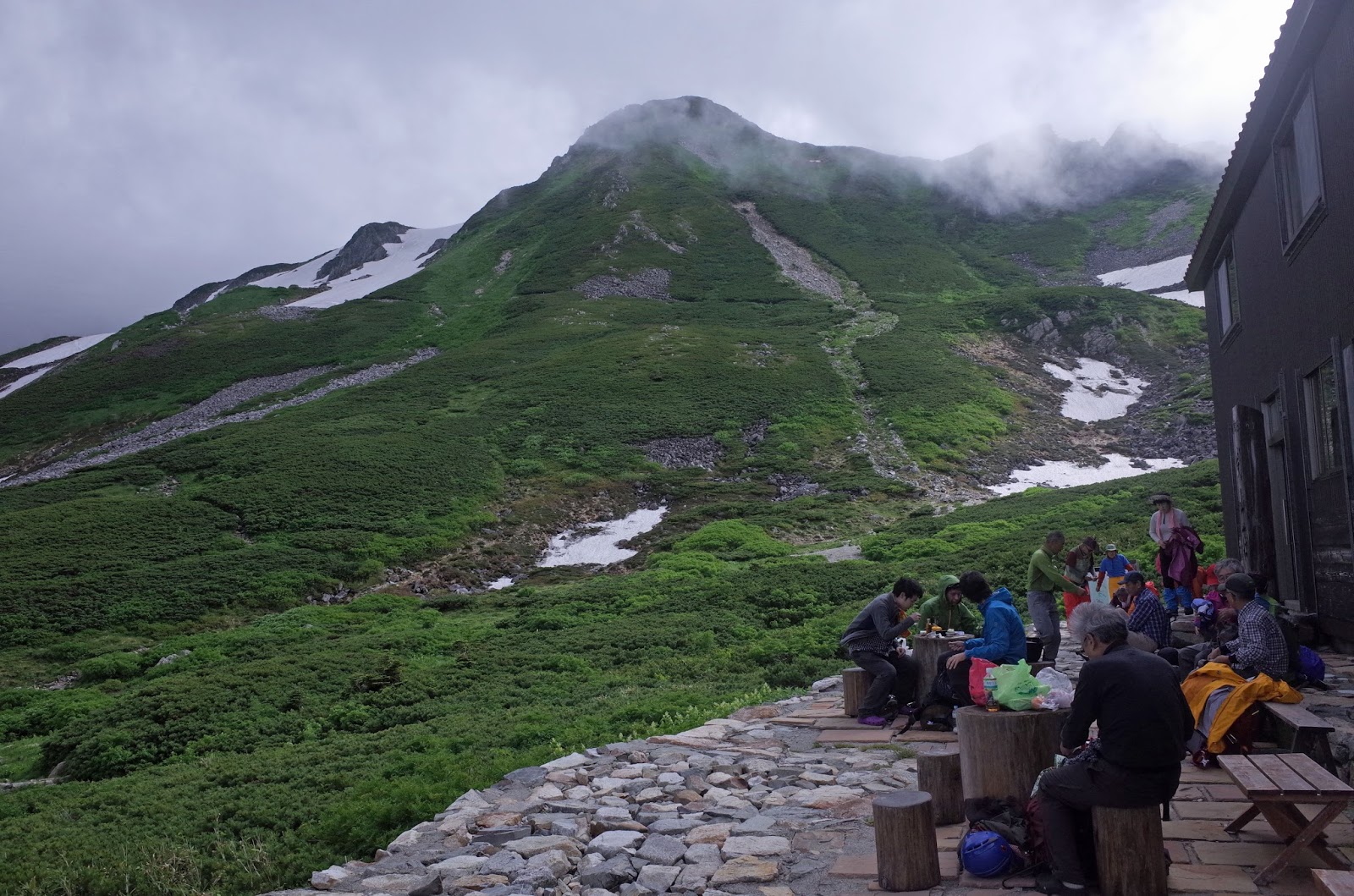 そして一服剱を過ぎると山荘はすぐ下に。雪渓を渡り山荘に到着したのはちょうど12時であった。山荘でコーヒーを飲みながら今日の行程をしみじみと思い出しランチをとる。