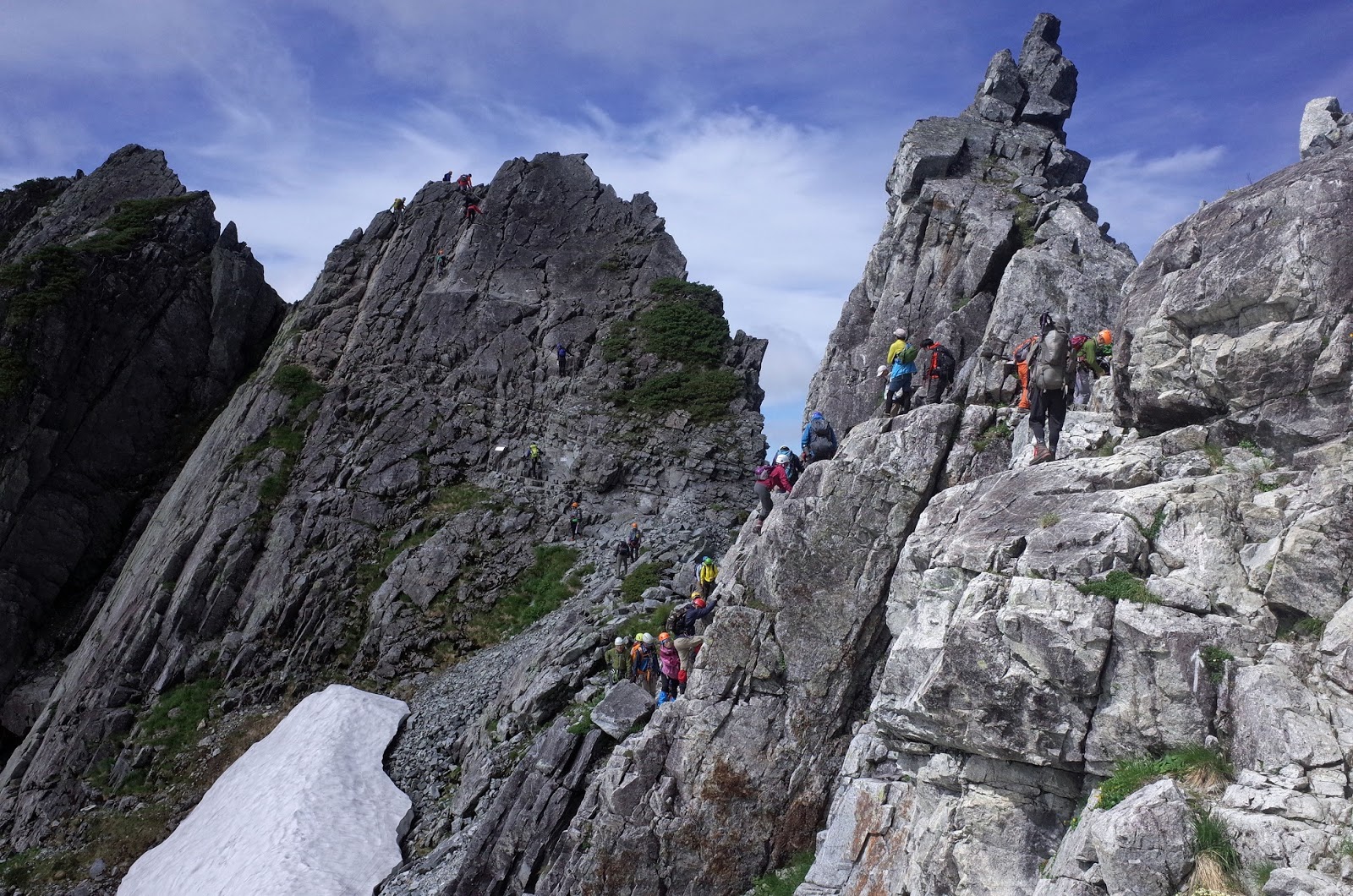 途中の雪渓で小屋の従業員らしき若者たちが一生懸命に雪渓に石を並べている。聞くと、濃霧の雪渓で方向を見失ってしまう人が多いので石を並べているのだとのこと。濃霧だと、とんでもない方向に行ってしまうそうだ。よく覚えておこう。