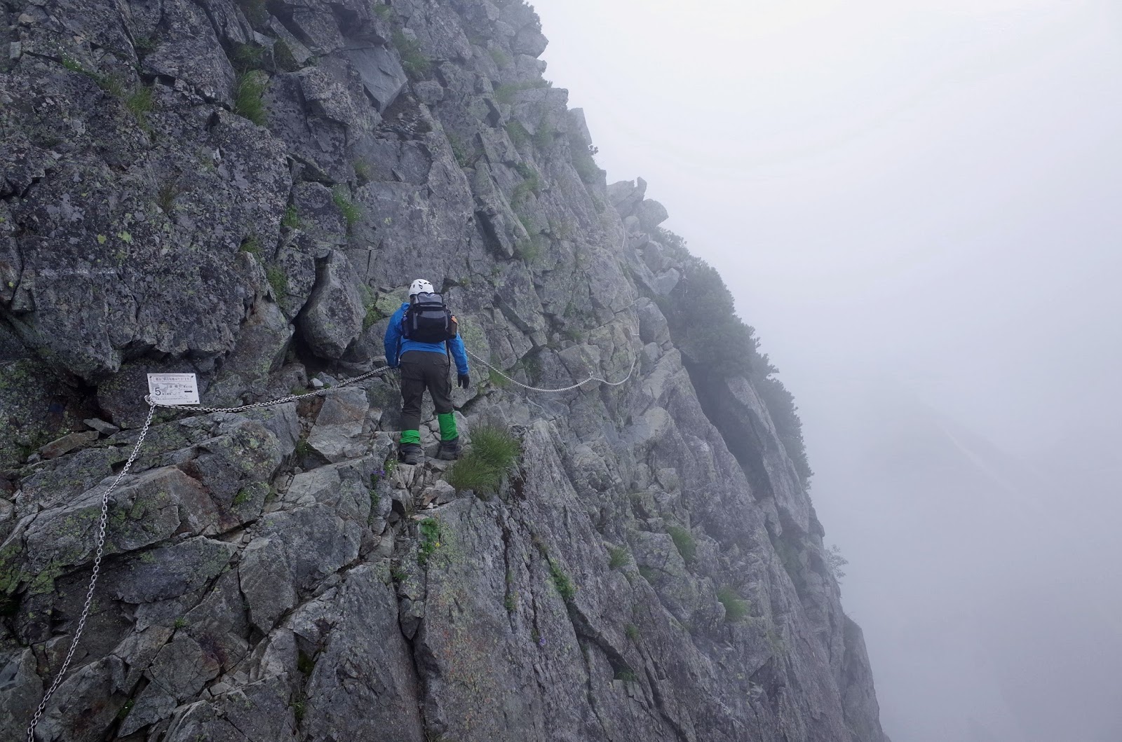 下山の最大の難所は「カニノヨコバイ」。ここも経験者にインタビューしてきいたところ。「怖いけど大丈夫」というのが結論。もっとも大切なのは鎖を握る力だと思い、ジムでトレーニングもしてきた。この力に余裕があれば楽に最初の一歩を探すことができる。しっかりと鎖を握り、全身を鎖にゆだね右足を下ろす。「あった、あった」、問題の最初のひっかかりはすぐに見つかった。そのままヨコバイして難所をクリア。想像したより短い。梯子を下り、少し歩くと登りルートに合流する。