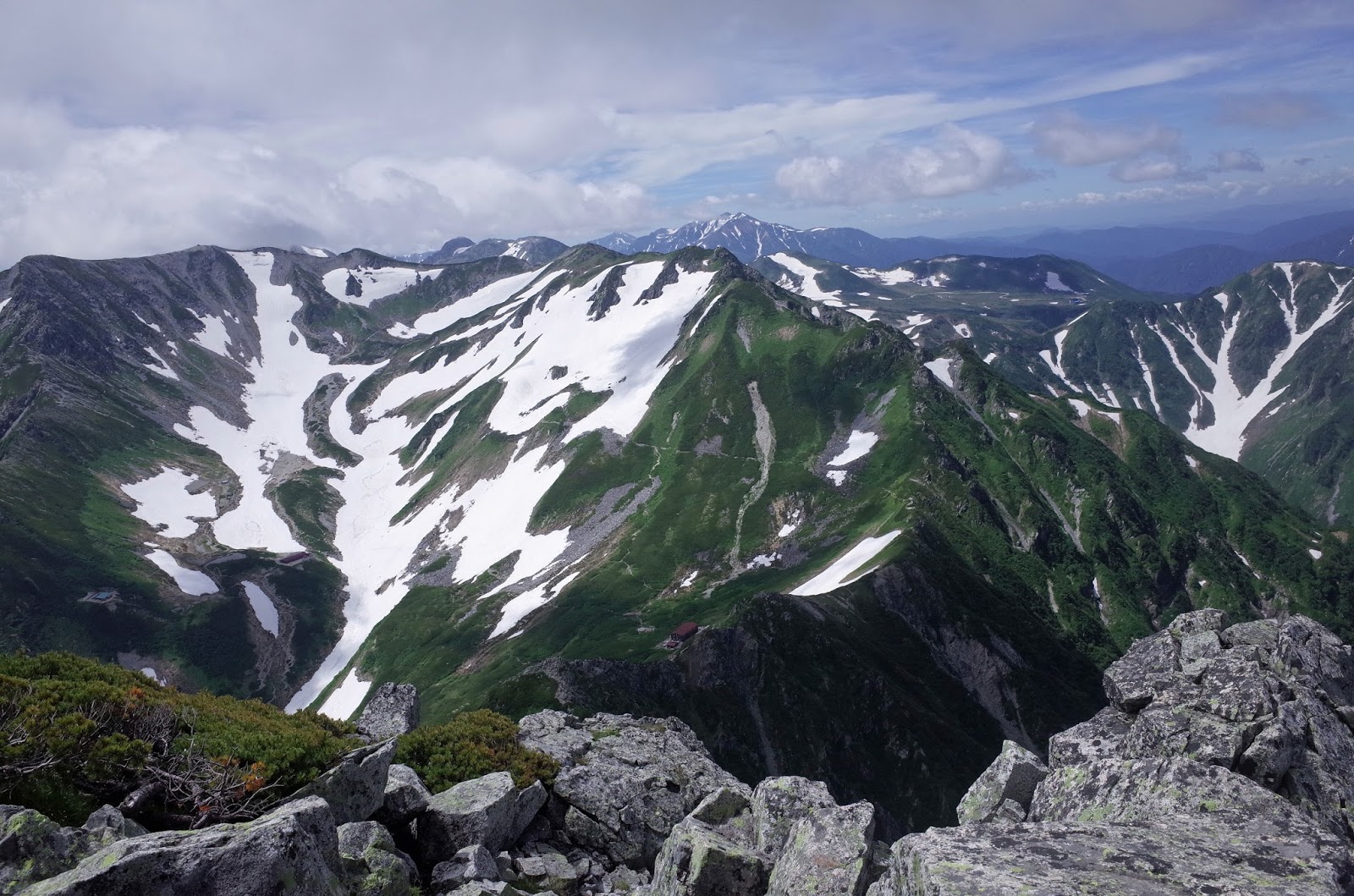 前剱より剱山荘を見下ろす。遠くは笠ヶ岳だそうだ。 |