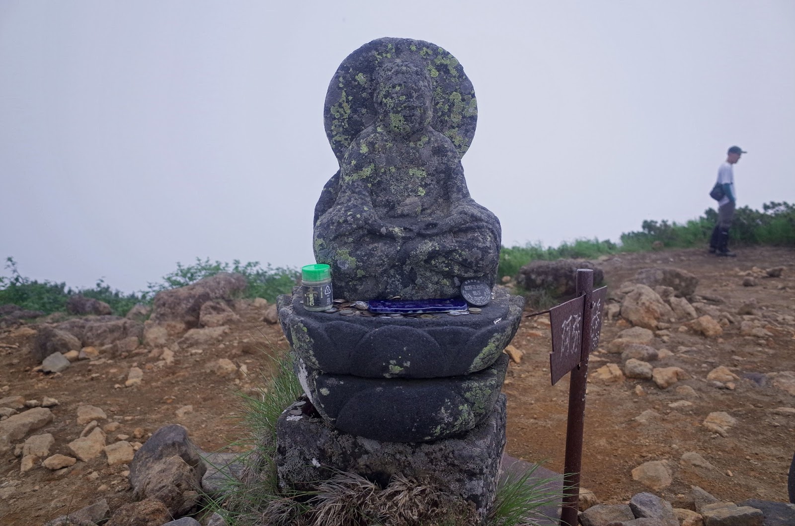 時計を見ると14時。多くの人がポールの前で記念撮影。私も登頂したグループのシャッターを押してあげた。ここも残念なことに下界はまったく見えない。雲の中に歓声が響く。