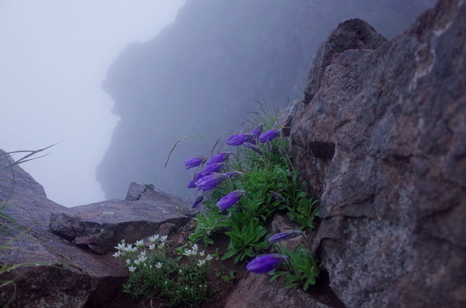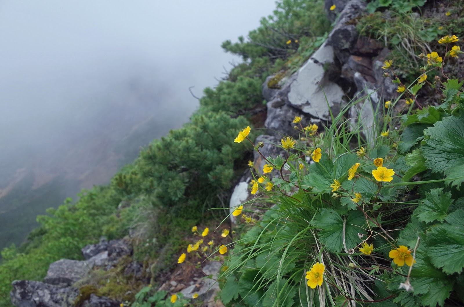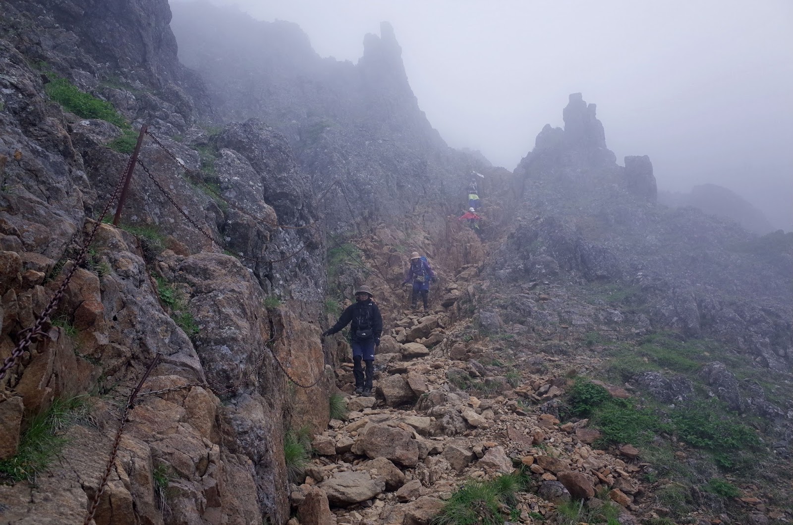 途中、長い鎖場、ハシゴ段、岩場登りが連続する。霧中の岩に咲くリンドウ、キンバイなどが彩りをそえる。こんな過酷なところに一生懸命に咲いている花に感動。