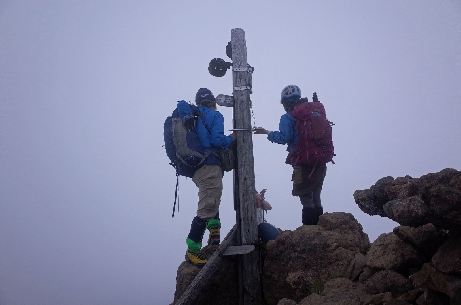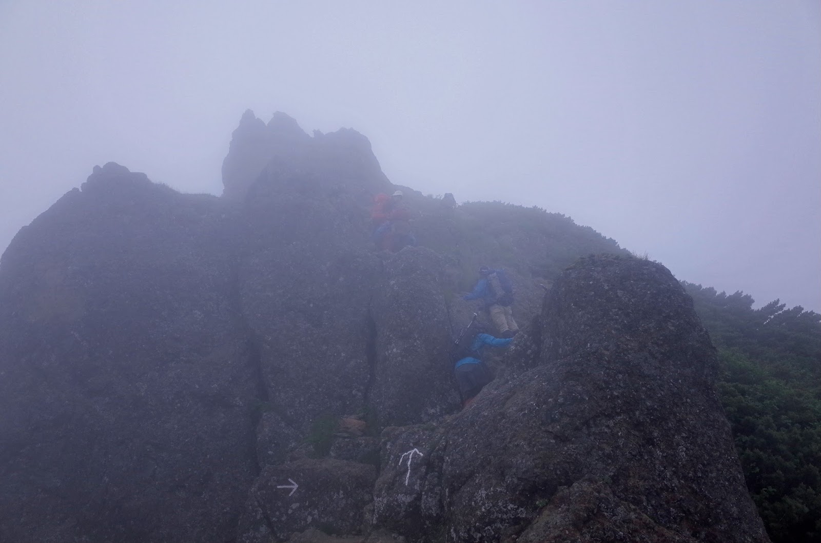 今回は濃霧の中の歩きがいかに危険か体験できたことだ。太陽や遠くの見透しがないと方向感覚をなくしてしまうのだ。これは夜間の歩きにも通じる。特に岩場歩きは道の識別が不明瞭なので、慎重に進まなくてはいけない。今回は明らかに崖っぷちに立ってしまったのでミスに気づいたが、識別不明瞭のまま、どんどんと深みにはまっていってしまったかも知れない。そうなると、方向感覚を失い、戻ることもできなくなるのだ。もっとも有効な対策は複数人で歩き、個人ミスを防ぐことなのかも知れない。たしかに道迷いは単独行者に多い。
