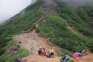 さあ、あとは直下の山荘「天望荘」まで下るだけ。とはいっても長い急斜面のザレ場だ。霧の中、鎖を頼りに慎重に下山。鎖がなければこのザレ場はとても下れない。やがてうっすらと霧のなかに山荘が見えてきた。到着は15時。受付に聞くとほぼ満員とのこと。食事はバイキング方式。しかし、おせじにも美味しいとは言えなかった。
