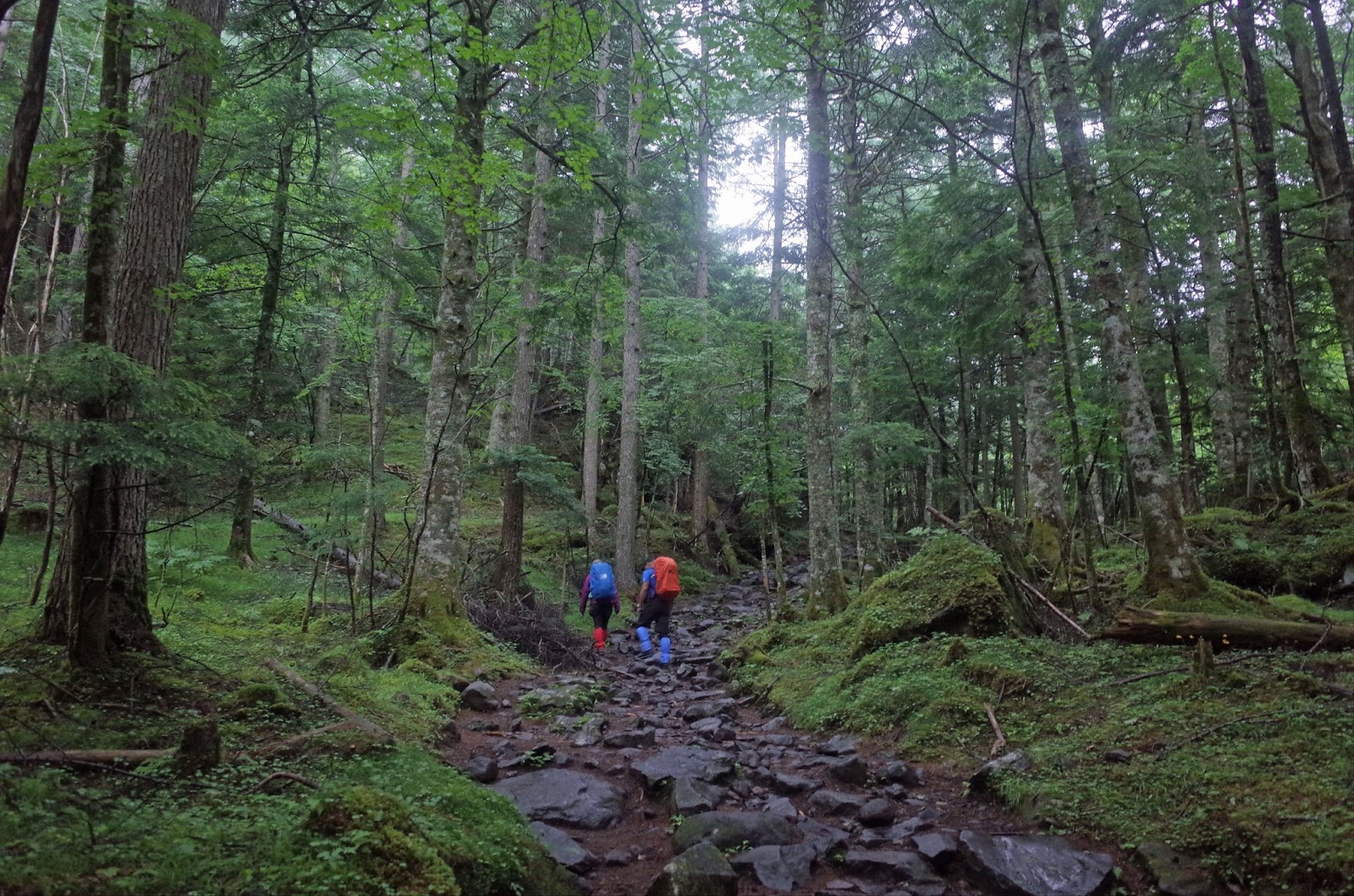 そんなことを思いながら歩を進めてるとやがて木々の間から日が差し込んできた。雨が止んだのだ。こうなったら蒸れるレインウエアーはいらない。即刻、ザックの中にしまい込んだ。道はコメツガの香りに包まれ一本調子で緩やかに登る。
