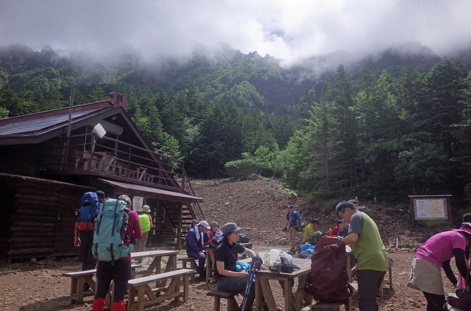 ほぼ標準コースタイムで行者小屋に到着。すでに先行者たちが思い思いの場所に色とりどりのテントを張っている。水も豊富だし、広いし、いいテン場だ。残念だが今日は八ヶ岳の尾根は雲に包まれて見えない。ほんの少しだけ、横岳の急峻な尾根が見えている。赤岳も阿弥陀岳もここからほぼ500メートルの標高差だ。かなりの急登となる。