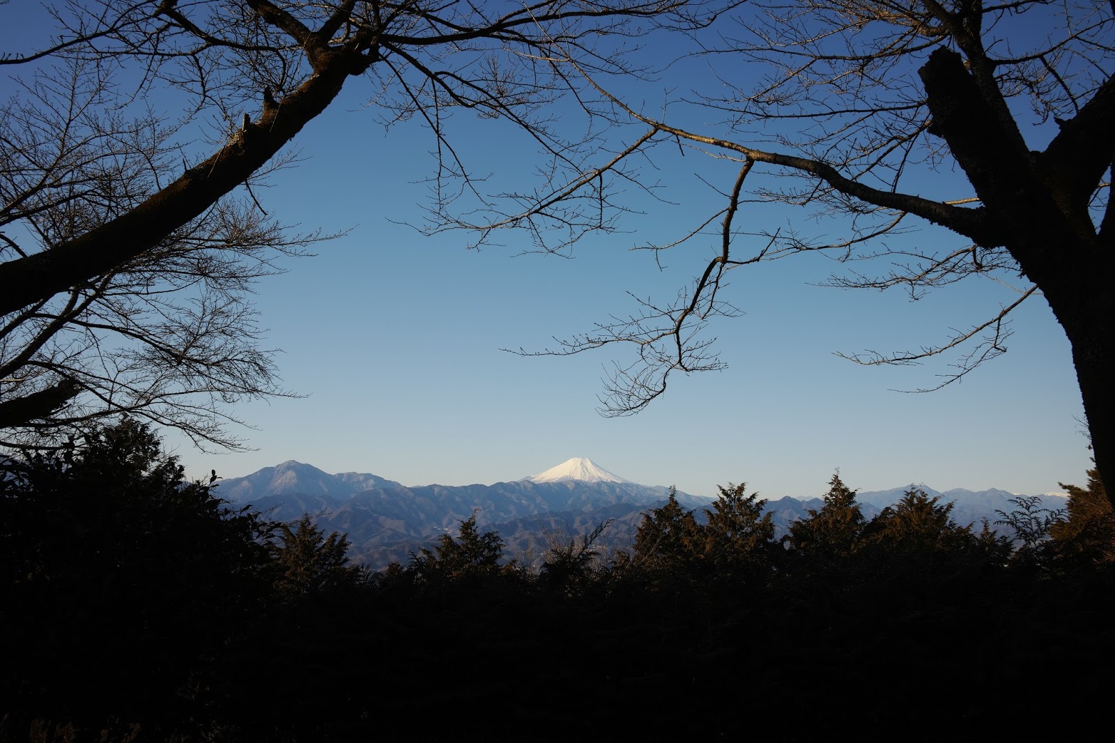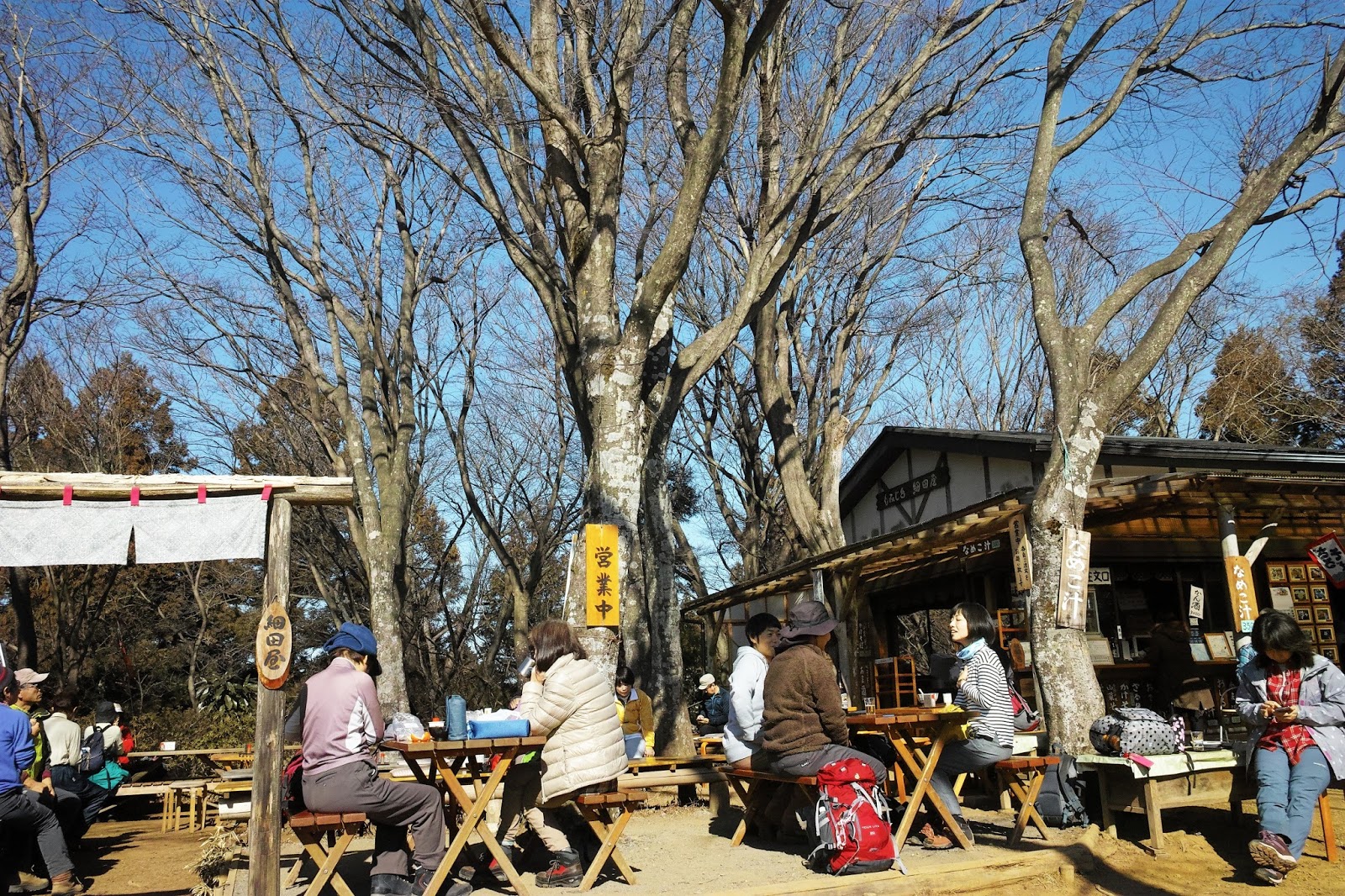 明王峠から高尾まではいくつかのピークを超えなくてはならない。しかしこの尾根道はピーク毎にまき道が用意されている。私はそのまき道への誘惑を断ち、実直にピークを踏みながら歩く。明王峠からほぼ1時間半で影信山に到着。時刻は11時。この影信山には2軒の茶屋がありベンチも用意されている。ハイカー達の休憩ポイントだ。ベンチからは遠く東京が一望でき、さらに振り返ると富士山も見える。今日はスカイツリーまではっきりと見えるではないか。私も荷をおろし、しばし展望を楽しんだ。