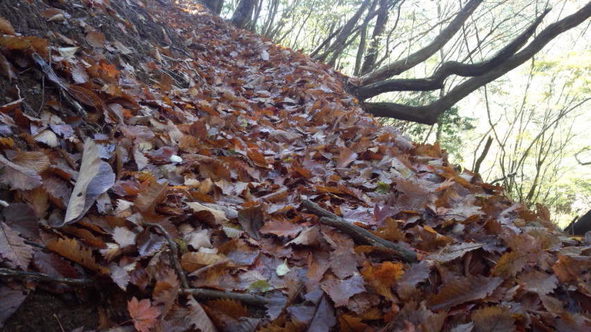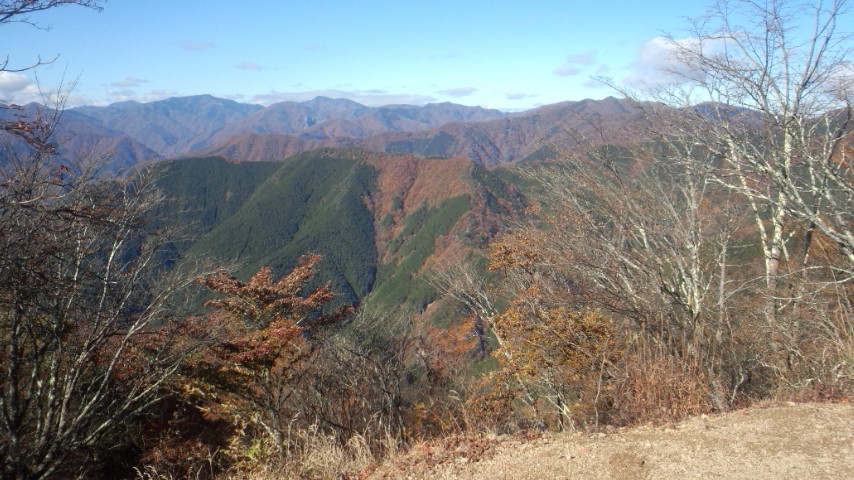 昨日までの雨天も影響か登山道は新しい落ち葉に覆われ、サクサクと気持ちのいい音が響く。リズミカルに音をならし、いっきに山頂に登りつめたのが10時。誰もいない。雲取山方面、御岳方面、蕎麦粒山方面、広角に見事な展望が広がる。愛機のカメラを持ってこなかったことを悔やむ。先月歩いた酉谷山に続く長沢背陵もはっきりと見える。