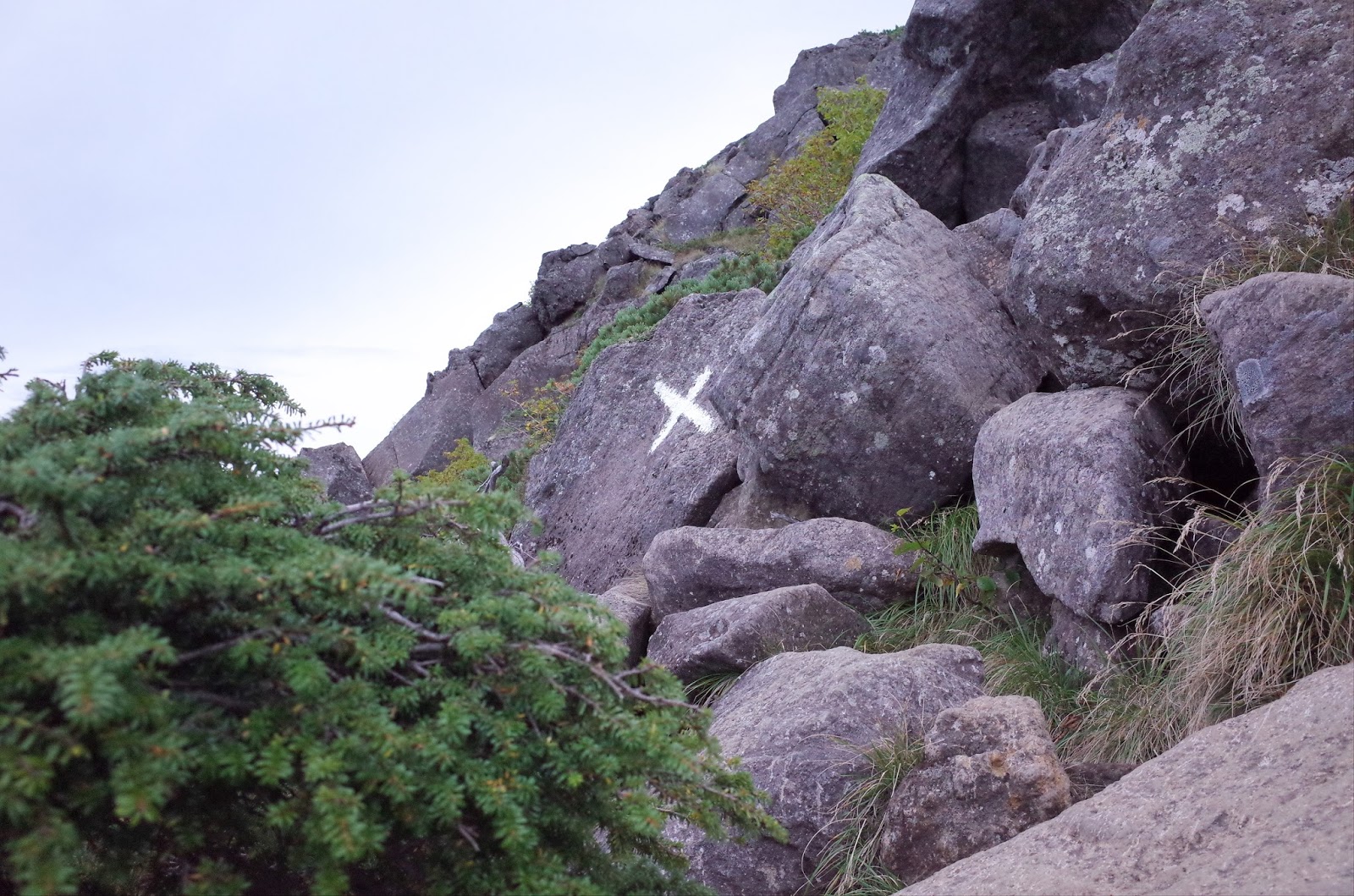 西天狗岳へ、上部の岩場に白いマークが見える |