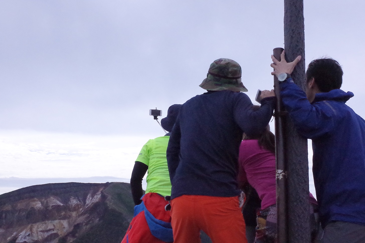 東の山頂は西とは異なり狭い。ここは稜線歩きの人々も通るので、よけいに混みあっている。かわりばんこにポールの前で記念撮影だ。私も居合わせたグループにシャッターを頼まれたので、思い切り東西南北4方向でシャッターを押し、おおいに感謝された。