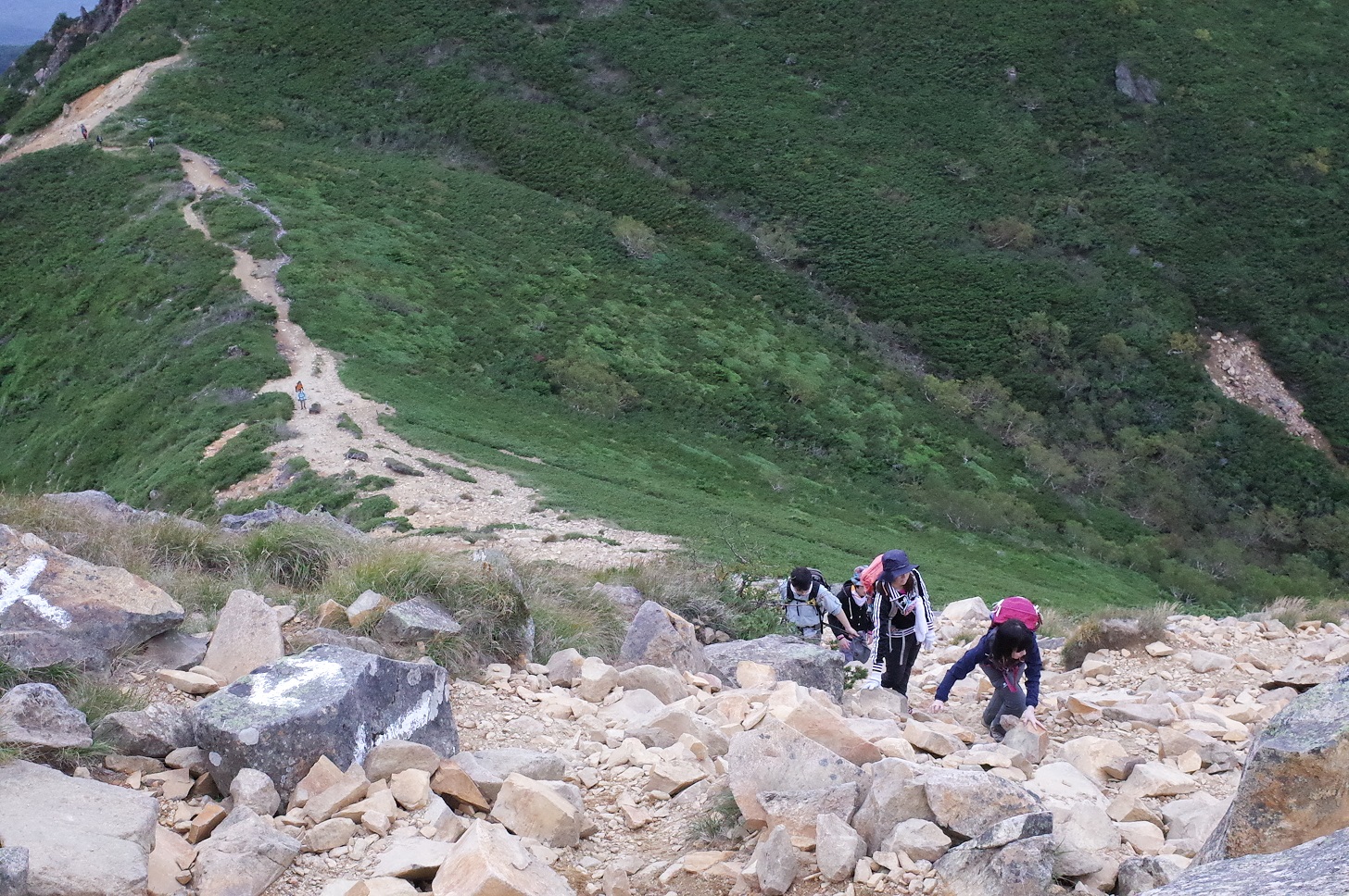 次から次へと登山者が東天狗岳に登ってくる。とても長居ができる雰囲気ではない。さあ、下るか。ここから黒百合ヒュッテまで2本のルートがあるが、今回は中山峠経由で下ることにする。そのほうが静かだろうと目論んだからだ。しかしその目論見は見事に外れた。次から次へと登山者が登ってくるではないか。考えてみれば中山峠ルートは縦走路なのだから登山者が多いのは当たり前だ。