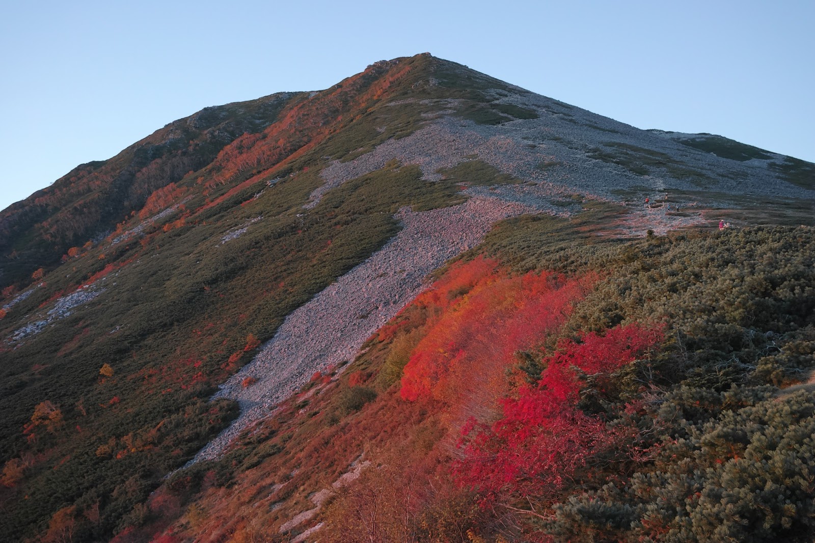 蝶ヶ岳の朝は寒い。氷点下だ。5時半のご来光を仰ぎ、ヒュッテの朝食をいただき、さあ常念へ。同宿の元気な登山者たちは常念の先、大天井までいくとのこと。おどろきと、ほんの少しの期待感とが交錯する。もしかして私にも歩けるかも。その小さな期待感をひそめ、薄暗い登山道を常念へ向かっていく。いくつかのピークを超え、とうとう常念への取り付きに達する。見上げると登山者が岩の間に蟻のように動いているのが見える。地図で確認すると標高差は300m超の岩稜斜面。