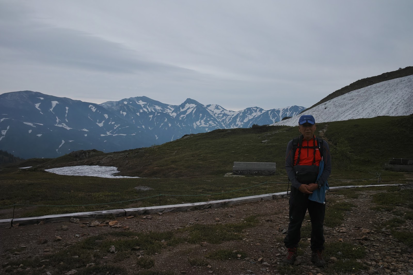 翌日は生憎の天気予報。山々は暗い雲に覆われている。朝食時に女史から間もなく風雨が強くなるので今日の白馬行は控えた方がいいとのアナウンス。食堂の窓から見える木が風に揺れていている。すでに白馬から来る予定客のキャンセルも入っているとのこと。実はそのアドバイスがなくても私は今日は蓮華に戻るつもりであった。昨日の疲れかたを顧みて、白馬までの登りを歩ける自信をなくしていたからだ。この女史のアドバイスは私の迷いと敗北感を取り除いてくれた。今日は蓮華に戻ろう。朝食のあと、白馬頂上宿舎へのキャンセル連絡を依頼。5時半、小屋からでて雪倉岳を振り返り、蓮華への道を歩み始めた。