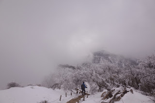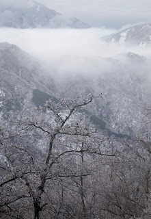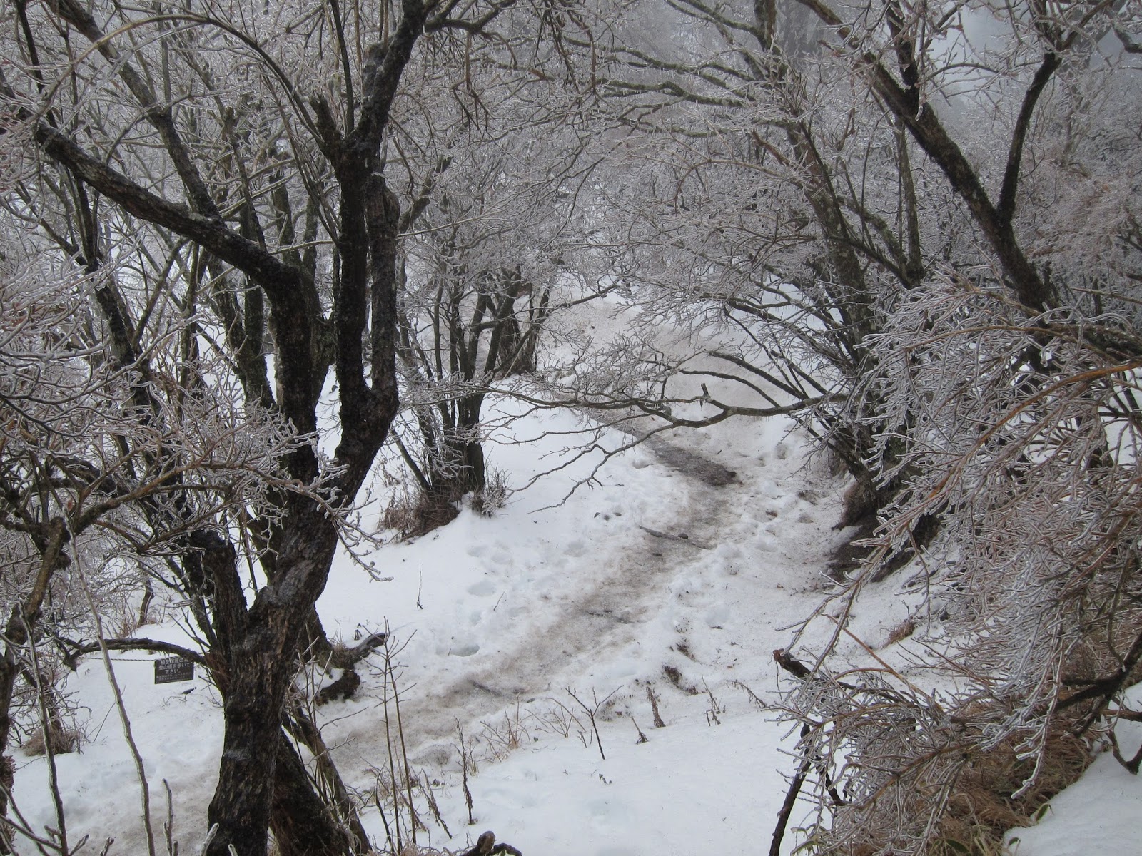低気圧が通過中。小雨降る中、霧氷を期待して塔ノ岳へ。いつもは登山者で満員のバスも乗客はたったの4人。しずかな大倉尾根だ。歩を進めると中腹あたりから薄っすらと霧氷が見えてくる。期待通りだ。小雨の中頑張って登ってきた甲斐がある。山頂直下からは木々の枝は厚く氷に包まれ輝いている。まるでガラス細工だ。これは霧氷ではなく雨氷と言うらしい。静寂に包まれ、雪上に輝く木々。自然のダイナミズムを感じる。![]() |