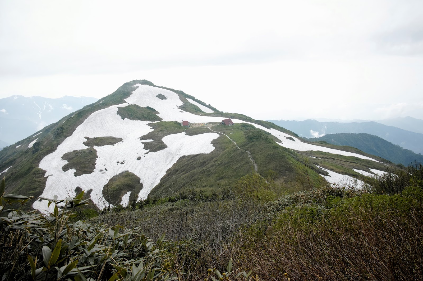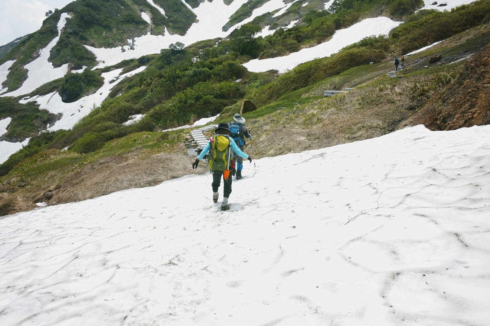 さあ、あとは朝日小屋まで下るだけ。木道を下り、残雪帯を渡り、やがて前方1㎞ほど下に朝日小屋の赤い屋根が見えてきた。ネットで見ていたあの朝日小屋だ。私を追い越した先行の登山者たちが小屋を目指して歩いているのが見える。私は最後の残雪帯を慎重にステップを踏みながら下りていく。