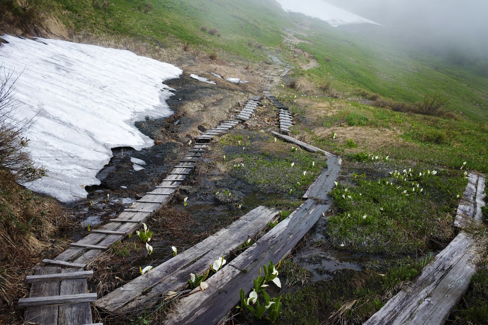 | 雪が融けて水芭蕉が咲き始める。ここはまだ春が来たばかりだ。 |