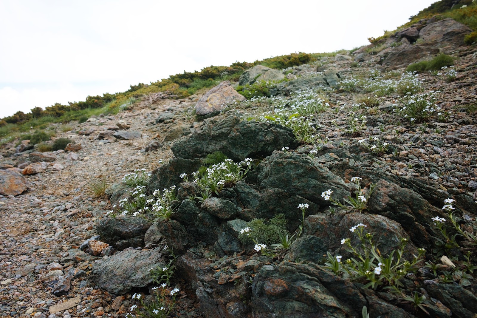 | 山頂への砂礫一面に咲くミヤマムラサキ |