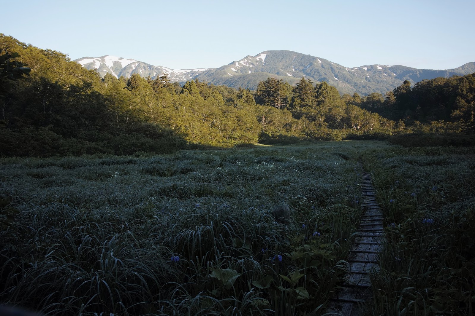 このコース、いきなり300メートルの下りから始まる。スタートから借金を背負うようなものだ。アヤメの咲く「平馬ノ平」をトントンと靴音を鳴らしながら木道を歩く。前面には雪に覆われた朝日岳が見える。あの山まで行くのかと思うと気が引き締まる。