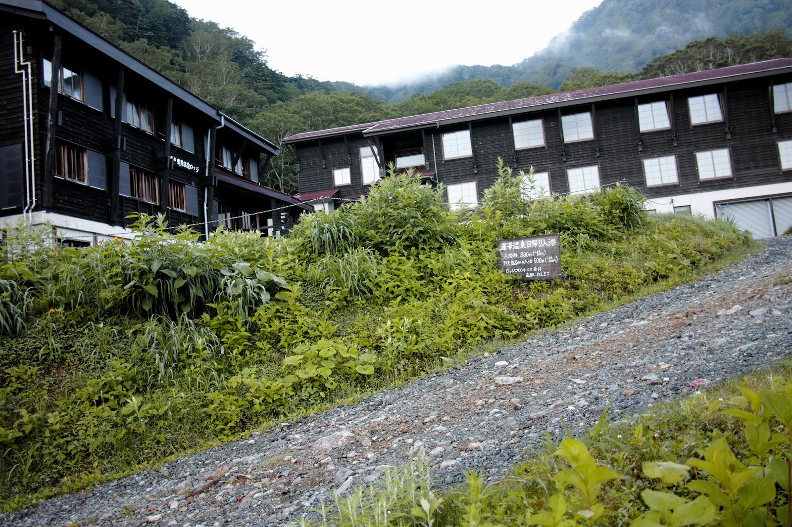 | 蓮華温泉から雲に包まれた朝日岳を見る |