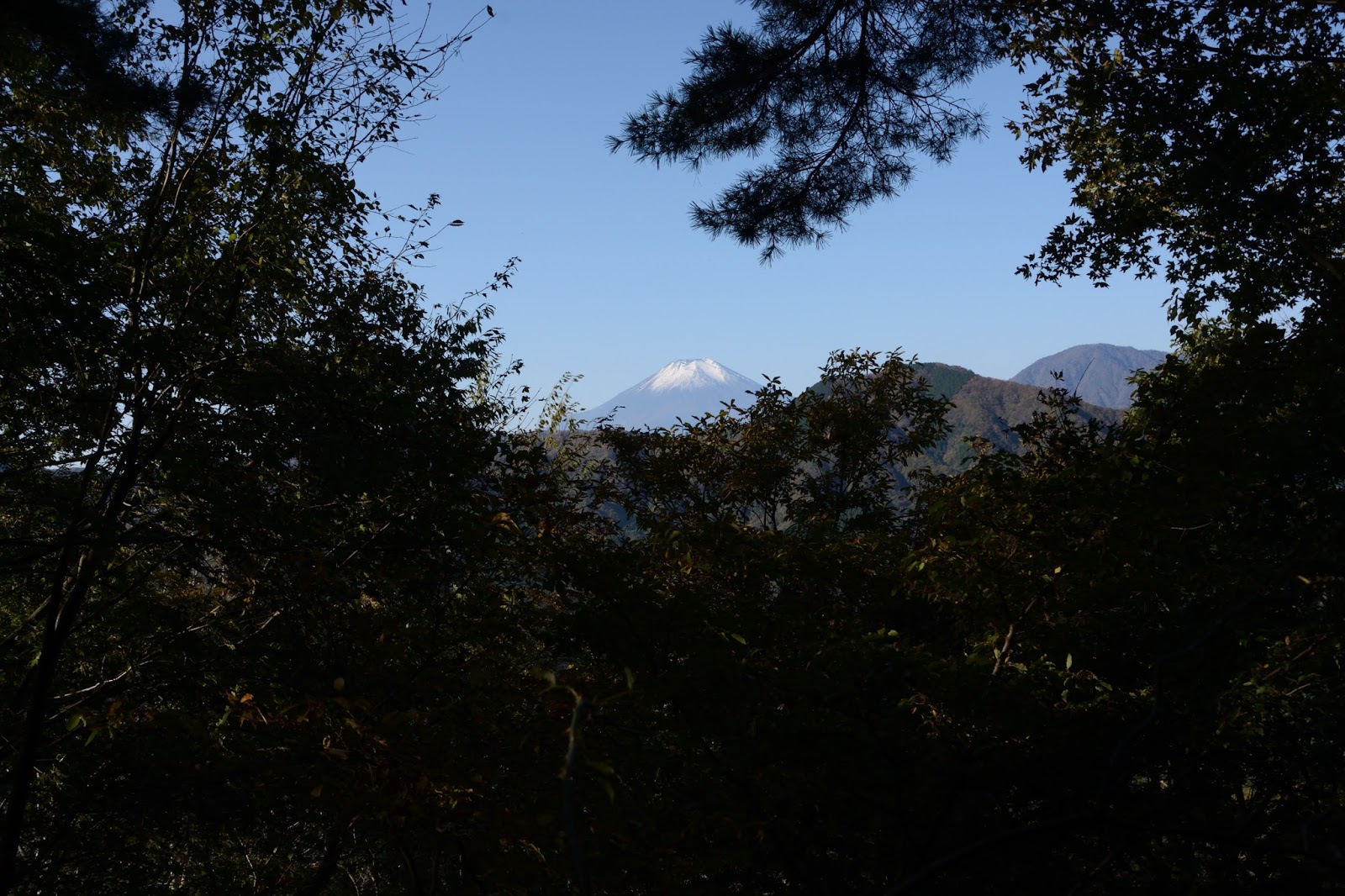 登山口のあたりは木々の色づきはまだまだ。緑の葉を透して朝日が差し込む。よく整備された歩きやすい登りをゆっくり歩く。前方右手上には大室山から山中湖に至る主脈尾根が見える。やがて富士が遠望できるポイントに。白くなった富士が木々の間に姿を現した。ここは峠を越せば山中湖。富士はもうすぐそこにある。