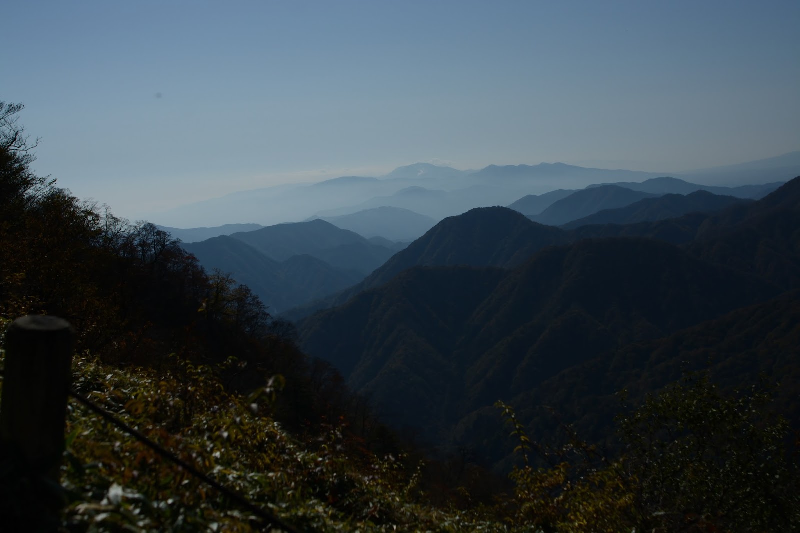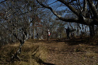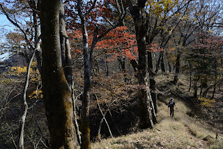 加入道山は標高1400メートル。ここまで登ると紅葉は終わりに近い。木々の間から目指す大室山も見える。さらにその先に檜洞丸。残念だが富士は霞の中にうっすらと。箱根に向かって峰々が霞みに浮かぶ。西丹沢の山深さを感じる。海を見下ろす表尾根とは異なる景色だ。