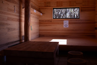 やがて静かな誰もいない加入道山の山頂に出る。すぐ下に避難小屋が。リニューアルした小屋にびっくり。きれになった。日誌を見ると昨日の土曜にも3人の記録が記されていた。| リニューアルした避難小屋 |