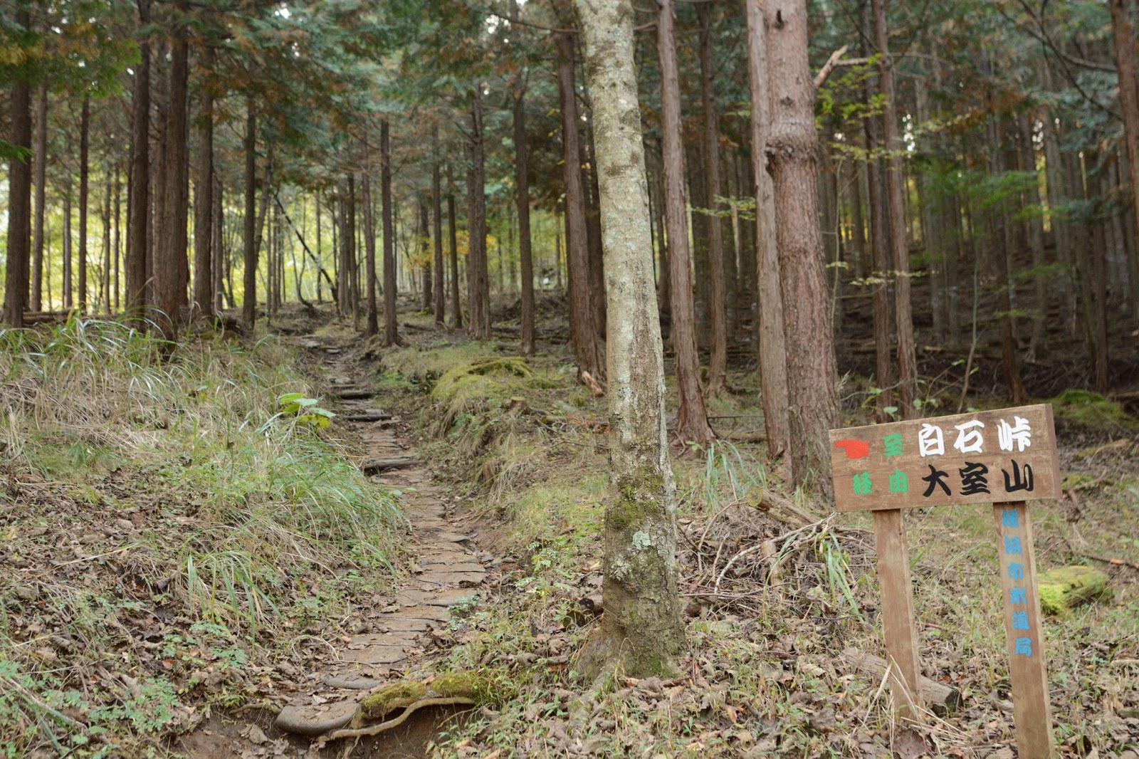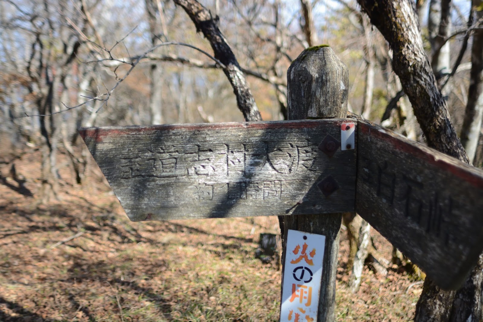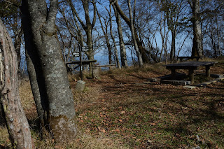 急登りのあと尾根道は平らな木道となりやがて大室山山頂に。ここまで4時間。撮影休止だけで歩いてきた。夏なら発汗のためこのような歩きはできない。大室山山頂は木が茂り展望は全くない。何人かの登山者が標識の前で記念撮影中。私はマラソンの折り返しのごとくにUターン。来た道を加入道山に戻る。