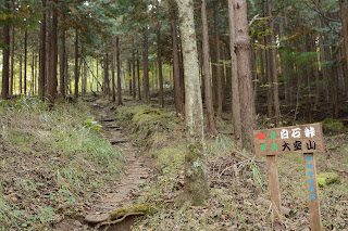 大室山まで尾根道は小さなコルまで下りそこから急登りだ。断続的に登山者とすれ違う。何人かの登山者が「熊、いませんでしたか」と聞く。彼らからみると私ははじめてのすれ違いの登山者なのだろう。あまり同じことを聞かれるので「そこにいましたよ」と応えてみたくなる。| 大室山への尾根道 |